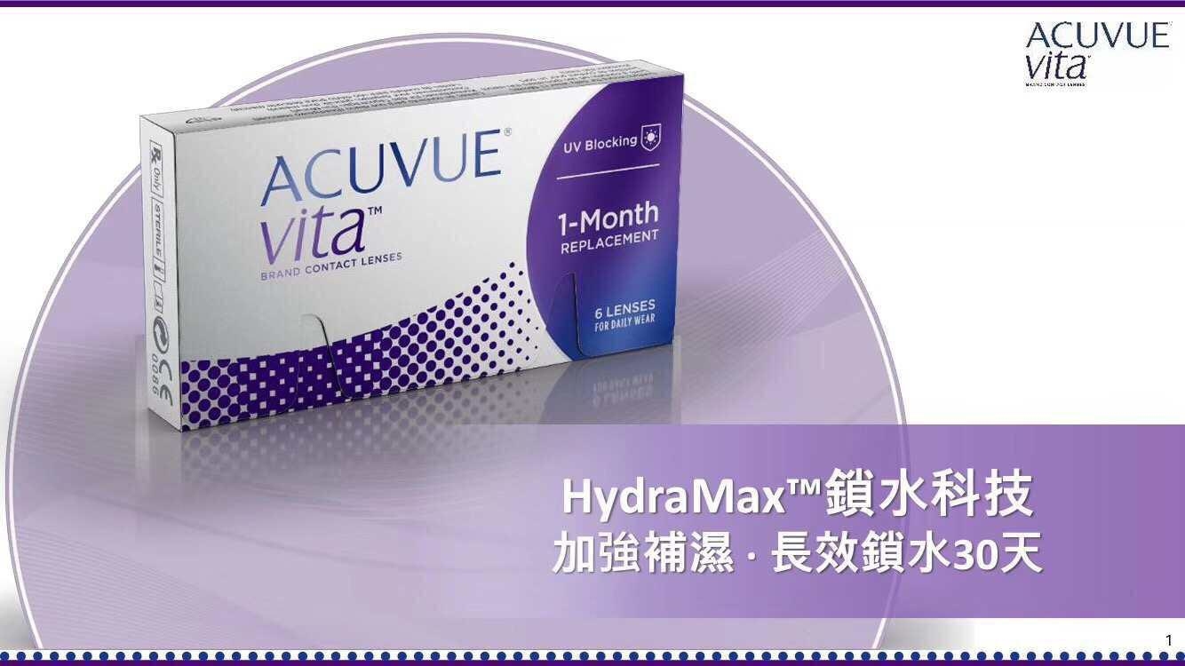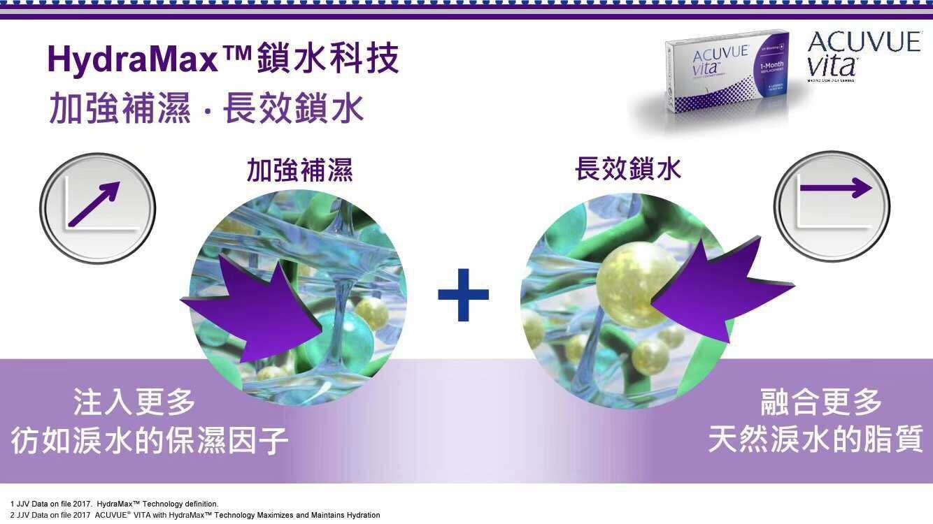 強生Acuvue 今星期上市全新月拋隱形眼鏡- VITA. 矽水凝膠物料,147高透氧,1級防UV. 澳門及部分香港重點商舖率先獨家發售。VITA採用HydraMax鎖水科技,該科技使隱形眼鏡能夠自然融合更多天然淚水中的脂質,利用天然脂質形成一層減少水份揮發的油脂層,達至長效鎖水30天。